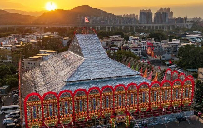 화려한 현판과 깃발로 장식된 이 거대한 구조물은 홍콩에서 가장 큰 규모를 자랑하며, 캄틴 지역 탕씨 가문이 주최하며 오는 토요일 저녁에 시작된다.