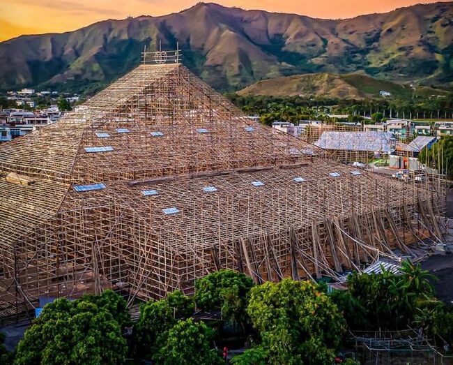 25,000개 이상의 대나무 기둥과 3,500개의 나무 기둥을 사용하여 10명이 넘는 장인들이 두 달 이상에 걸쳐 건설한 이 제단은 약 5층 높이로 최대 6,000명을 수용할 수 있다.