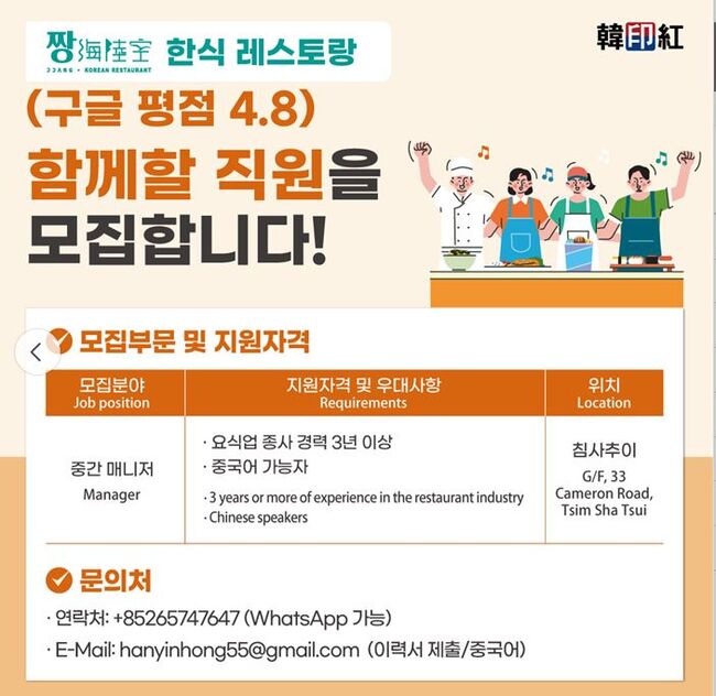 ■ 굽네가 각 잡고 만든 치킨 굽네 장각구이 출시! 굽네치킨 구인 : 홀 매니져, 캡틴, 직원 / 주방 직원 지원자격 : 홍콩아이디(워킹비자 지원가능), 워홀비자 보유자 지원/문의 : 오피스 9551-5186 (평일9am~6pm)