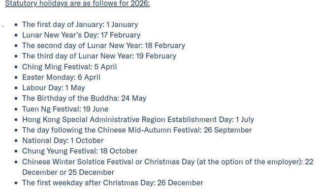 홍콩한인들이 모인 ‘홍콩생활방’에서도 공휴일이나 특정일이 되면 여지없이 문의가 올라온다. 고용상황과 기간이 달라 헷갈릴 수 있어 정리해 해보았다.