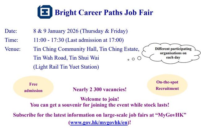 노동부는 오늘 8일(목)과 9일(금) 양일간 틴수이와이 틴칭 커뮤니티홀에서 '밝은 진로를 위한 취업 박람회(Bright Career Paths Job Fair)'를 개최한다. 50여 개 업체가 참여하여 총 2,300여 개의 일자리를 제공한다.