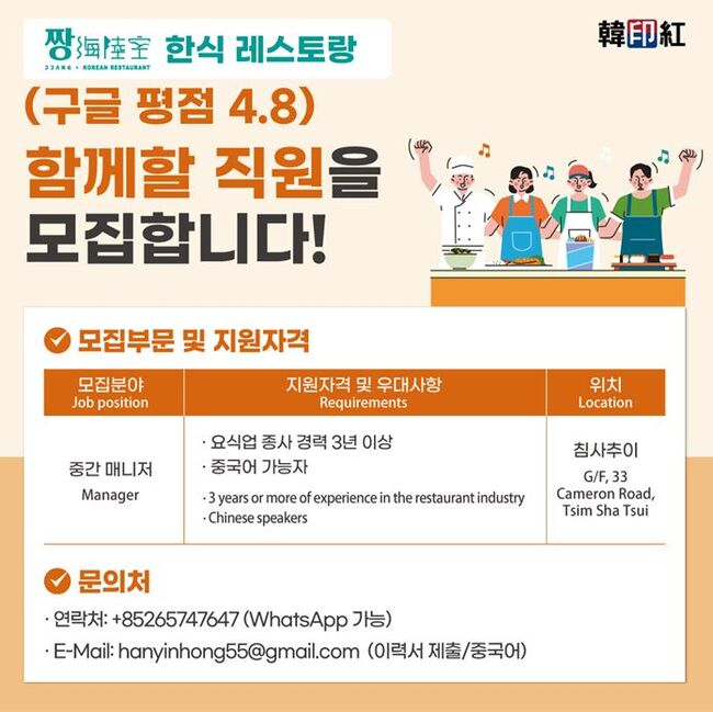 ■ 굽네가 각 잡고 만든 치킨 굽네 장각구이 출시! 굽네치킨 구인 : 홀 매니져, 캡틴, 직원 / 주방 직원 지원자격 : 홍콩아이디(워킹비자 지원가능), 워홀비자 보유자 지원/문의 : 오피스 9551-5186 (평일9am~6pm)