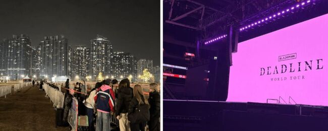 K-POP 블랙핑크의 3일간의 월드 투어 콘서트 '데드라인'이 어제 24일 토요일 카이탁 스타디움에서 개막했다. 열성적인 팬들은 스탠딩석 앞자리를 확보하기 위해 영하의 추위 속에서 밤새도록 줄을 섰다.