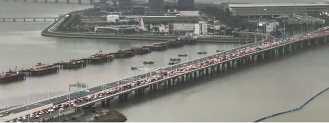 온라인 영상에는 오후 6시 30분경 대교에서 약 5km에 달하는 차량 정체가 발생했으며, 차량 행렬은 끝없이 이어졌다. 오후 7시 현재, 주하이 항(홍콩 방향)에서는 차량 행렬이 500m를 넘어섰고, 대기 시간은 40분 이상이었다.