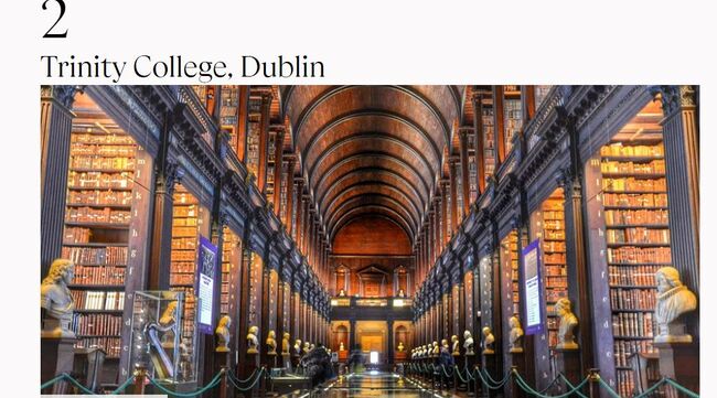 더블린 트리니티 칼리지는 400년이 넘는 역사와 약 620만 권에 달하는 장서, 필사본, 악보를 보유한 도서관으로 2위를 차지했다. 테네시 주에 위치한 시와니 대학교는 컴벌랜드 고원의 아름다운 경관과 인상적인 올 세인츠 채플이 특징이며 3위에 올랐다.