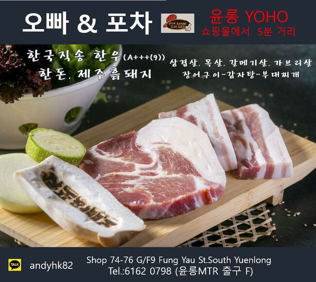 ■ 오빠&포차: (윈롱YOHO 쇼핑몰근처): BBQ 한국직송한우(A++(9)최상급, 예약 6162 0798 / 카톡 andyhk82andyhk82 ) *최상급의 고기를 가성비 최고로 제공합니다. 한돈, 제주흑돼지 - 삼겹살, 목살 - 감자탕, 부대찌개 - 장어구이 주소 : Shop 74-76 G/F9 Fung Yau St.South Yuenlong Tel.:6162 0798 (윈롱MTR 출구F)