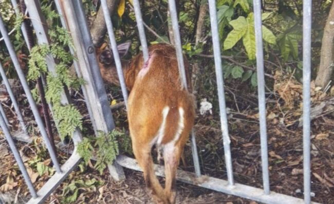 타이와이의 한 주택가 맞은편 철제 울타리에 갇힌 문착사슴 한 마리가 목요일 아침 구조되어 자연으로 돌아갔다.