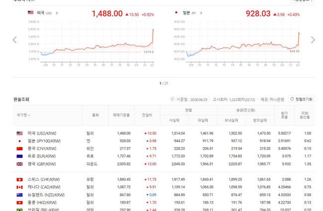 4월 29일 원/미달러 기준환율 1,488, 원/홍콩달러 기준환율 193.61