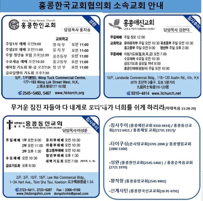 ▲▲홍콩한국교회협의회교회: ※왕척항(홍콩중앙교회(2545 9901) ※성완(홍콩한인교회(2545-5460 ) / 홍콩순복음교회(2721 1970)※침사추이(홍콩동신교회(2723 6411/홍콩제일 교회(2735 3357)/홍콩애진교회(9310 4414 ※타이쿠싱(온사랑교회(3705 2098)/ 홍콩엘림교회(2886 5300) ※신계사틴(홍콩한국선교교회(26 95 4791)