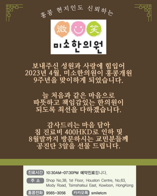 ■ 미소한의원 : 한방과립제, 침, 추나, 부황치료 20프로 할인/ 고려대학교 심리학과 졸업, 홍콩, 중국 등록 중의학 전문의 / 몸과 마음 치유 문의환영 카카오톡 smiletcm / 문의 9565 3056