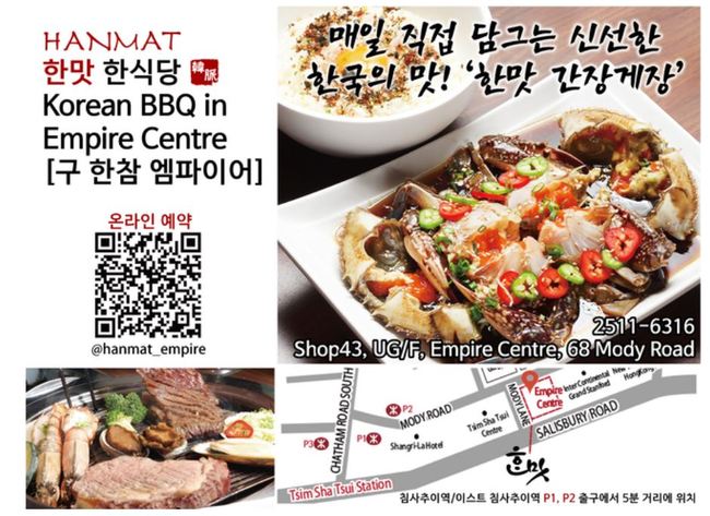 ▲ 한맛 엠파이어(구 한참 엠파이어) : 한참엠파이어가 '한맛'으로 변경 (HANMAT Korean Reataurant(Empire Centre 고기와 게장이 맛있는 문화나눔의 한식당, 동침사츄이 리갈구룡호텔 맞은편, 예약번호 2511 6316 (침사추이 P1, P2 출구