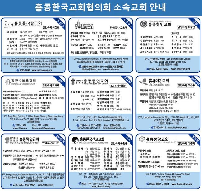 ▲▲홍콩한국교회협의회 교회 : ※왕척항(홍콩중앙교회(2545 9901) ※성완(홍콩한인교회(2545-5460) / 홍콩순복음교회(2721 1970)※침사추이(홍콩동신교회(2723 6411/홍콩제일교회(2735 3357)/홍콩애진교회(9310 4414 ※타이쿠싱(온사랑교회(3705 2098)/ 홍콩엘림교회(2886 5300) ※신계사틴(홍콩한국선교교회(2695 4791)