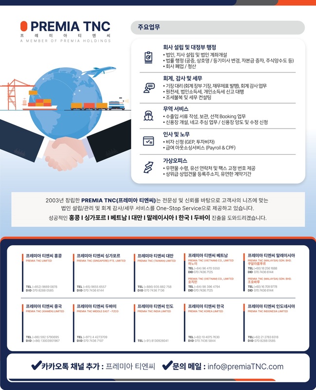 ■ 프레미아 티엔씨 (구 코차이나 티엔씨) : 법인 설립/관리, 회계 결산, 세무 자문 및 회계 감사 9669 0878, info@premiatnc.com / 웹사이트 https://premiatnc.com/kr//