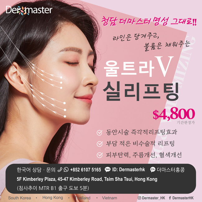 ▲ 더마스터홍콩 ①신규고객 HIFU Plus 또는 레이저토닝 1회 hkd198 ②눈밑울트라콜 hkd998 ♡한국어상담·문의 카톡ID: Dermasterhk / 카톡채널: 더마스터홍콩 / TEL: 61075165