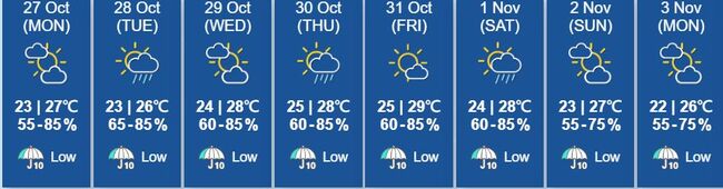 오늘과 내일 중국 남부 지역에 북동계절풍의 영향이 미친다. 오늘 낮최저 기온은 23도, 낮최고 기온은 27도이다.