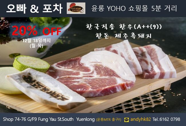 ■ 오빠&포차: (윈롱YOHO 쇼핑몰근처): BBQ 20% 할인(월-목) 12월 18일까지 한국직송한우(A++(9)최상급, 예약 6162 0798 / 카톡 andyhk82andyhk82 )