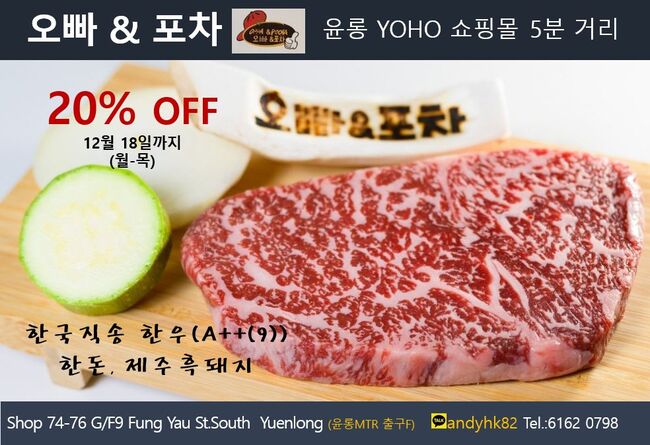 ■ 오빠&포차: (윈롱YOHO 쇼핑몰근처): BBQ 20% 할인(월-목) 12월 18일까지 한국직송한우(A++(9)최상급, 예약 6162 0798 / 카톡 andyhk82andyhk82 ) 한돈, 제주흑돼지 - 삼겹살, 목살 - 감자탕, 부대찌개 - 장어구이 주소 : Shop 74-76 G/F9 Fung Yau St.South Yuenlong Tel.:6162 0798 (윈롱MTR 출구F)