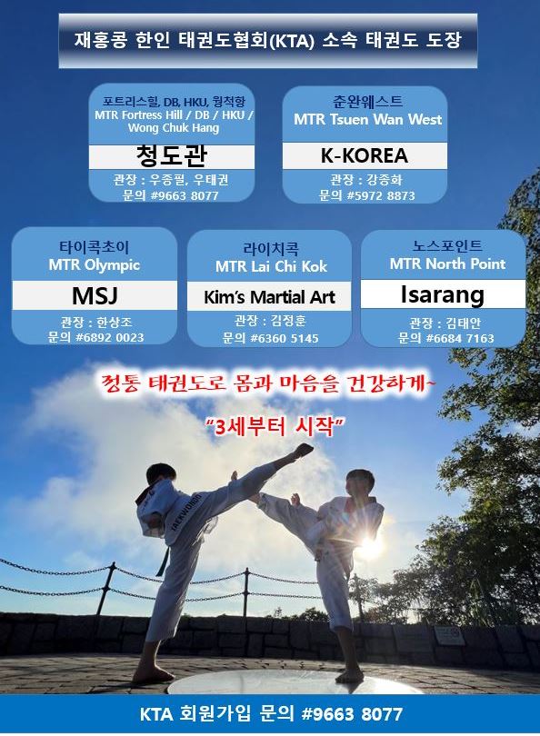 ▲청도관(포트리스힐, DB, HKU, 웡척항, 센트럴 :관장우종필 , 우태권#9663 8077) ▲K-KOREA (춘완웨스트:관장강종화#5972 8873)