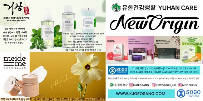 ■ Geosang 巨商 거상 (HK) Ltd. WWW.KJGEOSANG.COM 98년 역사를 자랑하는 대한민국 제약회사 1위 기업인 유한양행 산하 유한건강생활, 국내 청정 지역 변산반도 자사 농장에서 직접 키운 비건화장품 메이드미 Meidem 문의전화 6768 6550