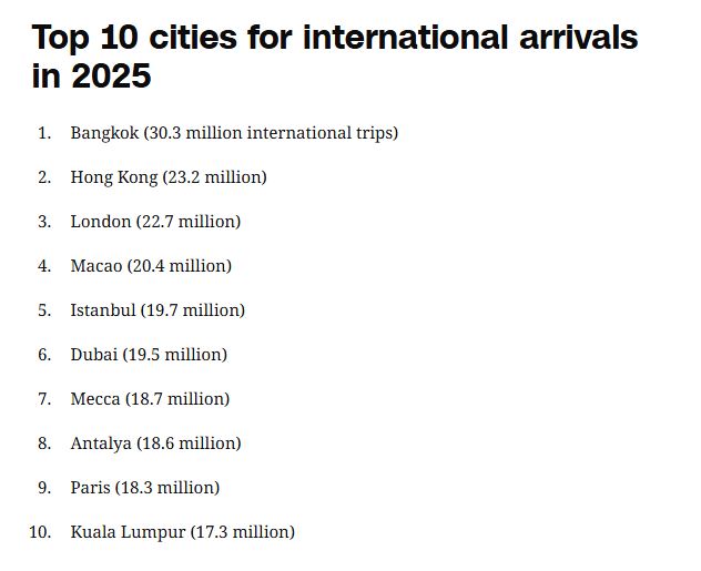 아시아 지역이 강력한 관광 성장세를 보이고 있다. 방콕은 관광 정책과 매력도 측면에서 다시 한번 세계 1위 도시로 선정되었으며, 2025년에 국제선 도착객 수에서도 세계 1위를 차지했다.