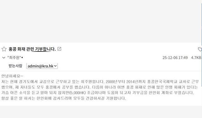 홍콩한인회는 성금을 홍콩 정부의 공식 모금 계좌로 전달하고오는 1230일에는 화재 참사 부상자를 위한 헌혈 활동에도 참여하는 등 도움을 이어갈 예정이다.