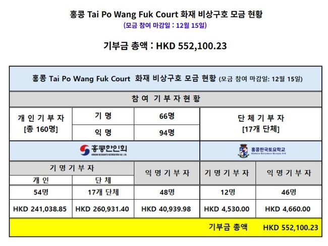 홍콩 '웡 푹 코트아파트 화재 참사 피해민 구호를 위한 모금에 나선 현지 한국 교민들이 1억원이 넘는 성금을 모았다 한인회는 참사 이튿날인 지난달 27일부터 이달 15일까지 552100홍콩달러(1443만원)를 모금했다.