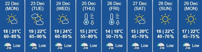 계절풍이 약해지면서 수요일 낮에는 따뜻한 날씨였다가 겨울 계절풍이 다시 불어오면서 크리스마스 연휴 기간 동안 중국 남부 해안 지역의 기온이 내려갈 것으로 예상된다. 내륙 지역은 낮과 밤의 기온차가 비교적 클 것으로 예상된다.