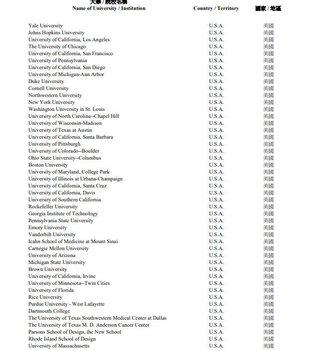 홍콩소재 대학교는 홍콩대학교, 중문대, 홍콩과기대시티유, 폴리유가 포함되었다.