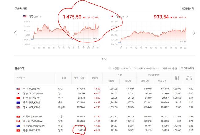 1월 17일 마감된 원화/미화 기준환율 1,475.50, 원화/홍콩달러 189.24