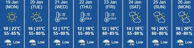 또한, 넓은 구름대가 지역을 뒤덮겠으며 동풍의 영향으로 남중국 해안 지역의 기온은 주말 동안 소폭 상승하겠지만, 아침에는 여전히 쌀쌀하겠다.