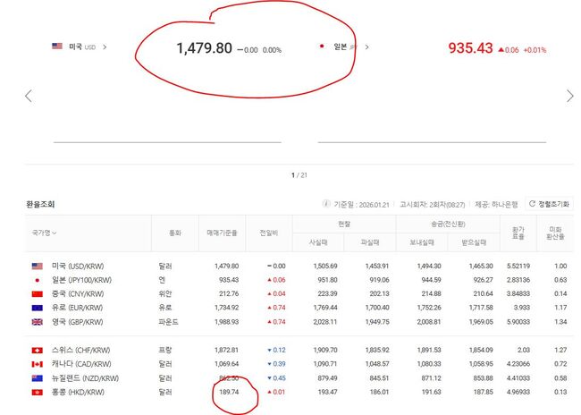 1월 20일 원화/미달러 기준환율 1,479.80, 원화/홍콩달러 기준환율 189.74