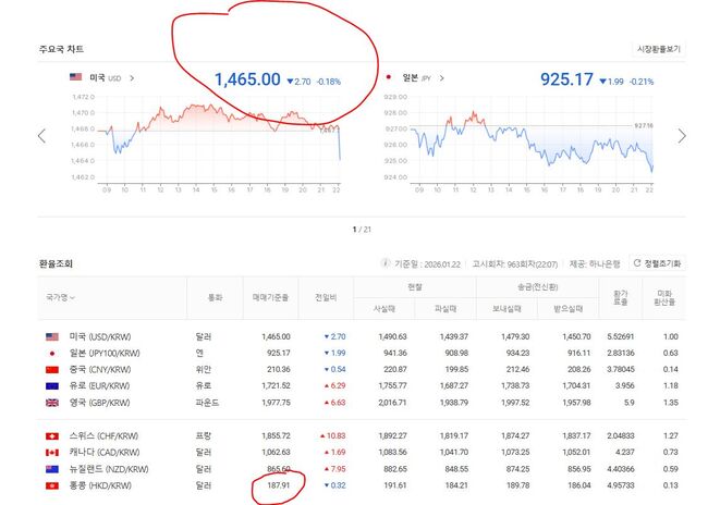 1월 22일 원화/미달러 기준환율 1,465, 원화/홍콩달러 기준환율 187.91