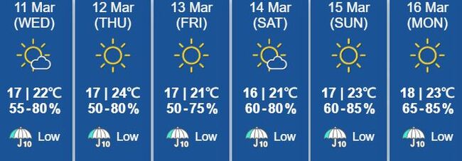 토요일에는 기온이 16도에서 21도 사이로 예상되며, 동풍이 풍속 4~5로 불고, 해상과 고지대에서는 때때로 풍속 6까지 강해질 수 있다. 신계 지역의 기온은 13도에서 14도까지 떨어지고, 타쿠링은 최저 기온이 12도까지 내려갈 수 있다.