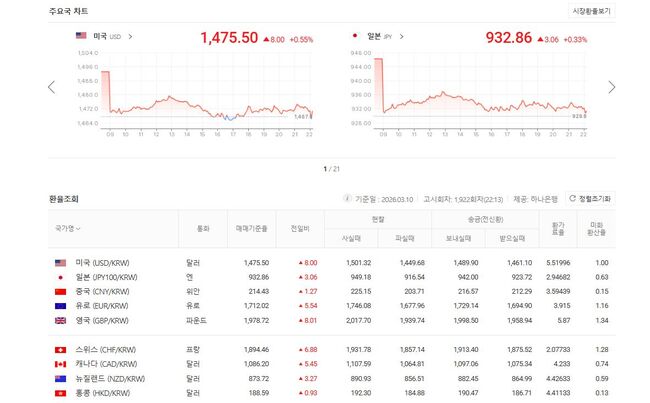 3월 10일 원/미달러 기준환율 1,475.50, 원/홍콩달러 기준환율 188.59