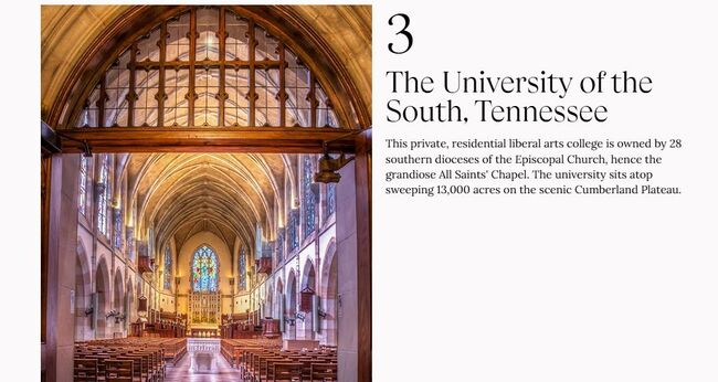 더블린 트리니티 칼리지는 400년이 넘는 역사와 약 620만 권에 달하는 장서, 필사본, 악보를 보유한 도서관으로 2위를 차지했다. 테네시 주에 위치한 시와니 대학교는 컴벌랜드 고원의 아름다운 경관과 인상적인 올 세인츠 채플이 특징이며 3위에 올랐다.