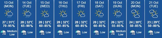 이번 주 중반과 후반에는 현재 소나기가 내리고 대체로 맑고 더운 날씨가 이어지다가, 북동 계절풍이 불어와 기온이 내려가 가을날씨로 접어들 것으로 예상된다.