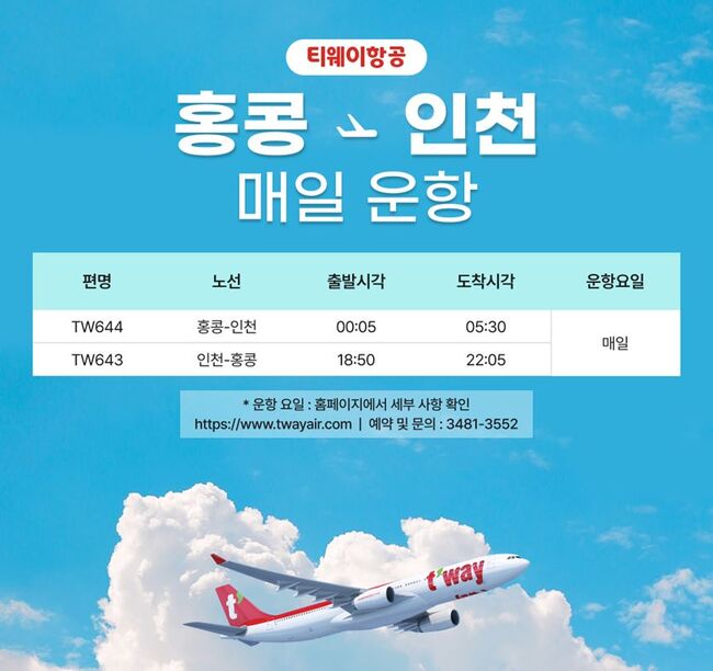 ■ 티웨이항공 : 운항시간 변경 / 매일 홍콩-인천 00:05 05:30 도착 / 매일 인천-홍콩 18:50 22:05 도착(운항요일은 웹사이트에서 확인www.twayair.com)