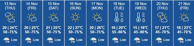11월 19일 최저 기온은 홍콩 전역에서 눈에 띄게 떨어질 것으로 예상된다. 웡척항, 와글란 섬의 최저 기온은 15°C로 예상되며, 그 외 대부분 지역은 14°C 이하로 떨어질 것으로 예상된다.
