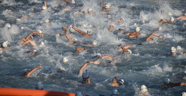 완차이 골든 보히니아 광장 부두에서 출발하여 침사추이 스타의 거리에서 끝나는 1km 코스에는 12세 초보자와 68세 베테랑 수영객이 함께 참가했다.