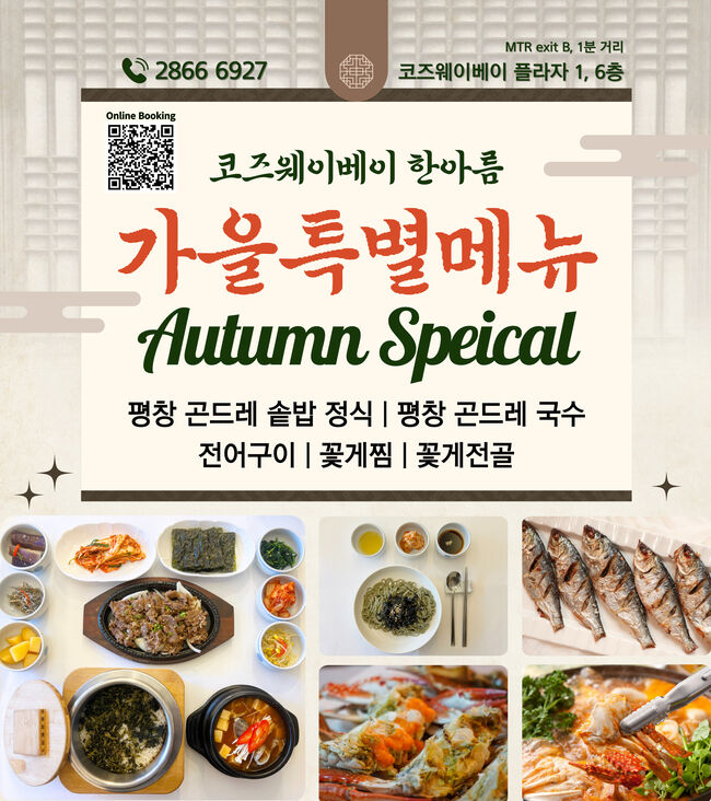 ■ 한아름(코즈웨이베이) 가을 특별메뉴/평창 곤드레 솥밥 정식 / 평창 곤드레 국수 / 전어구이/ 꽃게찜 / 꽃게 전골/ 문의 예약 2866 692