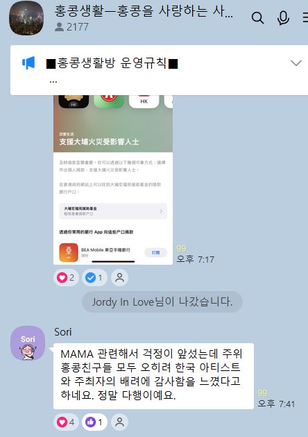 홍콩한인들이 모인 카카오톡 단체톡방 "홍콩생활방"에서는 "대형 참사 중에 마마어워즈는 취소되어야 한다.", "애도 분위기로 진행되어야 한다.", "취소하기도 애매하다"등의 여러 의견이 있었다.