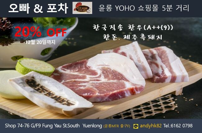 ■ 오빠&포차: (윈롱YOHO 쇼핑몰근처): BBQ 20% 할인(월-목) 12월 18일까지 한국직송한우(A++(9)최상급, 예약 6162 0798 / 카톡 andyhk82andyhk82 )