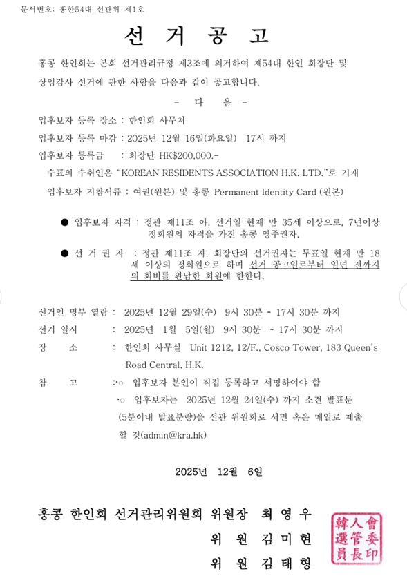 ■ 제 54대 한인 회장단 및 상임감사 선거 공고