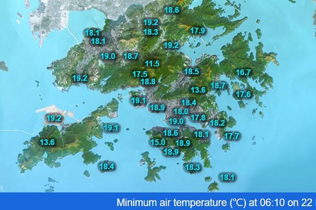 오늘 22일 오전 6시 10분 현재, 홍콩 각 지역 기온