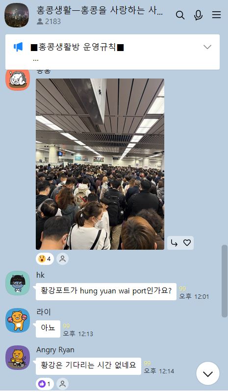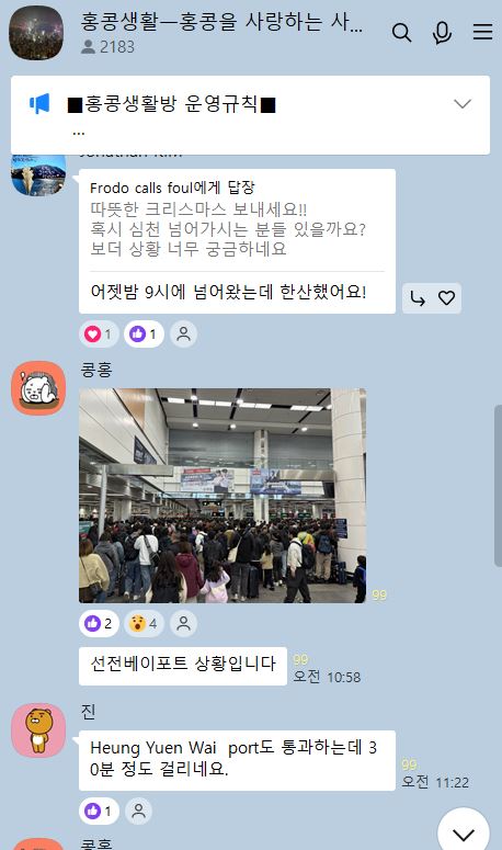한편, 홍콩한인들 2,183명이 모인 “홍콩생활방”에서는 각 육로지점의 상황을 실시간으로 공유하고 있다. ‘홍콩생활방’ 실시간 공유에 따르면 오늘 오후 12시 30분 현재 중국선전을 방문하는 선전만, 헝유와이, 황강포트 그리고 주하이 국경지점은 홍콩을 빠져나가는 사람들로 매우 혼잡하다.