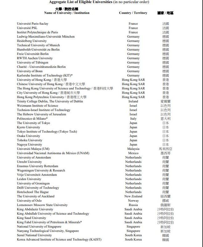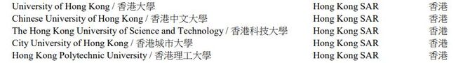 홍콩소재 대학교는 홍콩대학교, 중문대, 홍콩과기대시티유, 폴리유가 포함되었다.