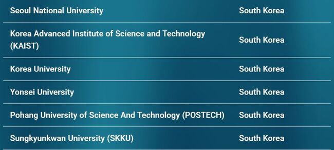 한국소재 대학교는 KAIST, 서울대학교, 연세대학교, 고려대학교, 성균관대학교, POSTECH이 포함된다.