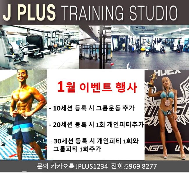 ■ 제이플러스 : 1월 이벤트 행사 10세션 등록시 ~ 그룹운동 추가 20세션 등록시 ~1회 개인피티추가 /30세션 등록시 ~개인피티 1회와 그룹피티 1회 추가