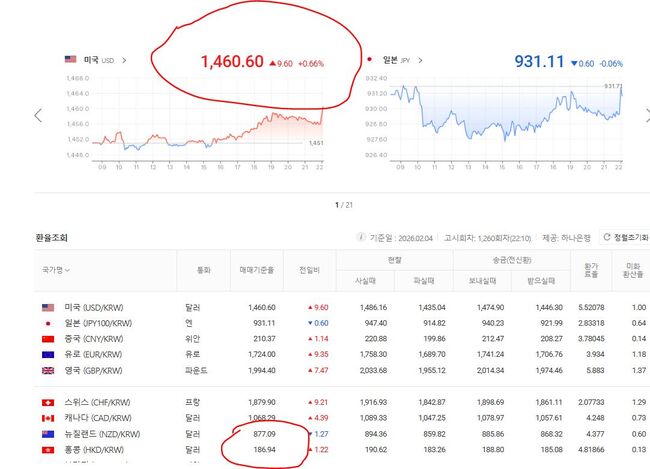 2월 4일 원화/미달러 기준환율 1,460.60, 원화/홍콩달러 기준환율 186.94