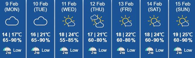 따뜻한 날씨는 설날 연휴까지 이어질 것으로 예상된다. 음력 설날 전날인 2월 16일은 대체로 흐리고 기온은 19°C에서 24°C 사이를 기록할 것으로 예보되었다.